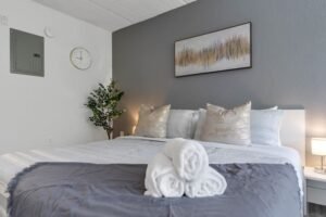 Queen bed . Air conditioning . Bed linens . Clothing storage . Extra pillows and blankets . Heating . Room-darkening shades . TV . Pack ’n play/Travel crib